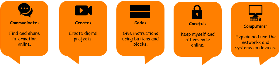Our curriculum is rooted in the National Curriculum Programme of Study for Computing and we have used this to develop a school model of the 5Cs of Computing: Communicate, Create, Code and Careful. Children will experience a half-termly project on each of the Cs (Communicate, Create, Code) which complements their class topic. This will be supported with a Careful lesson to ensure children are digitally literate and able to navigate their project safely. This begins in the Early Years Foundation Stage through Personal, Social and Emotional Development; Physical Development; Understanding the World and Expressive Arts and Design. By the end of their Ash Grange journey, children will be familiar with a range of programmes and devices, ready for their next steps in KS3 and beyond.