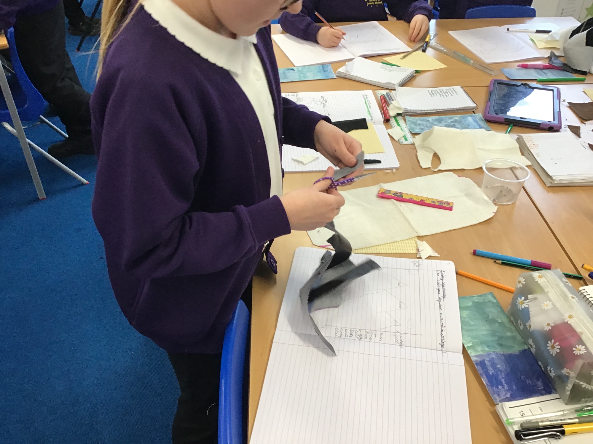 In DT, we designed our own mountain collage and used layers of material to create the scene, using running stitch and back stitch.