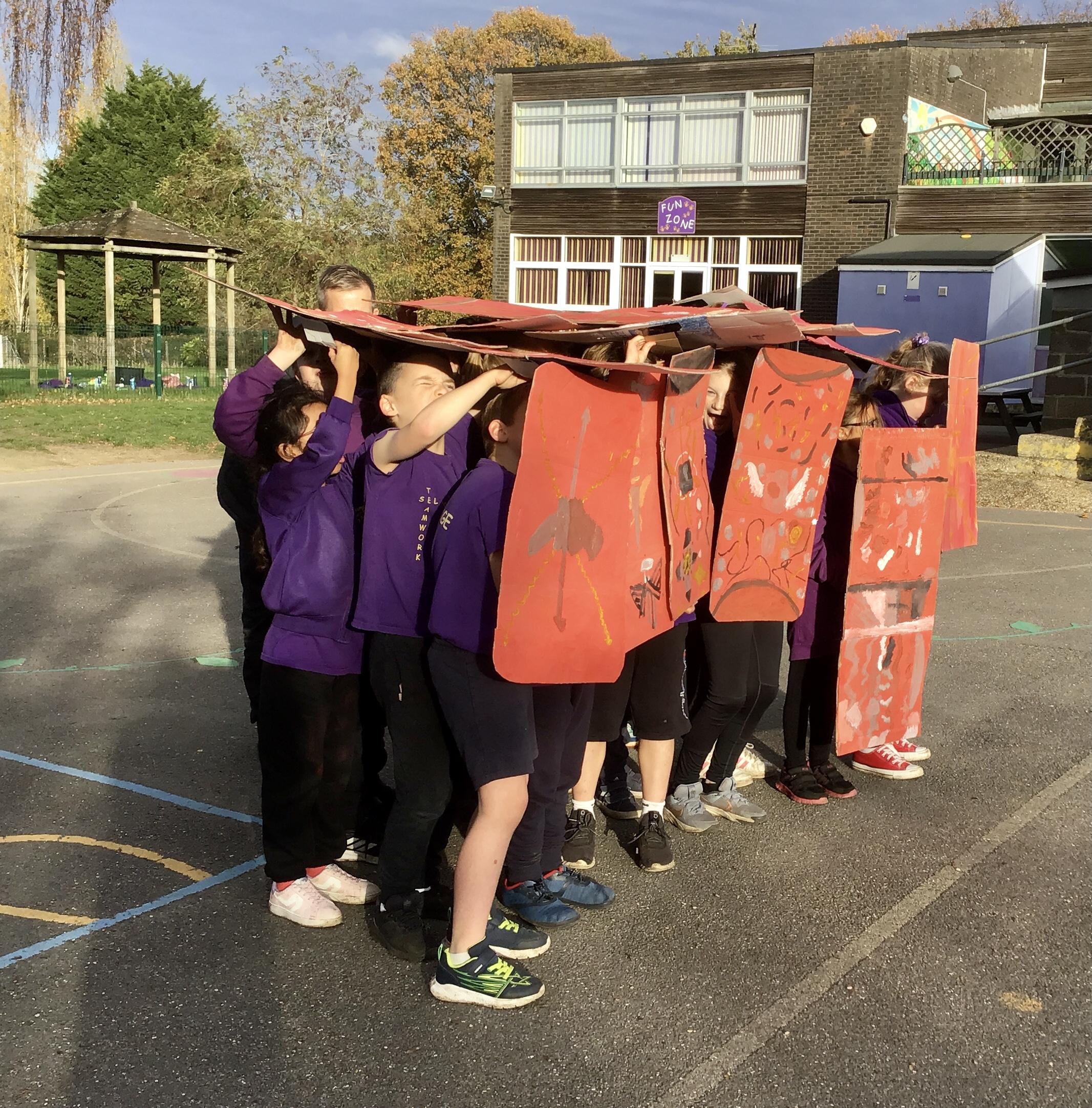 We started our topic by finding out that the Romans were a powerful and clever ancient civilisation. They ruled over many lands and their organised army helped them to conquer successfully. Therefore, we decided to become a Roman soldier ourselves! We designed and made our own shield before creating a 'turtle' formation - protecting ourselves from every angle - which the Romans introduced. We then put it to the test by going into battle and coming under attack! It was great fun! Take a look at our photos and short video below!