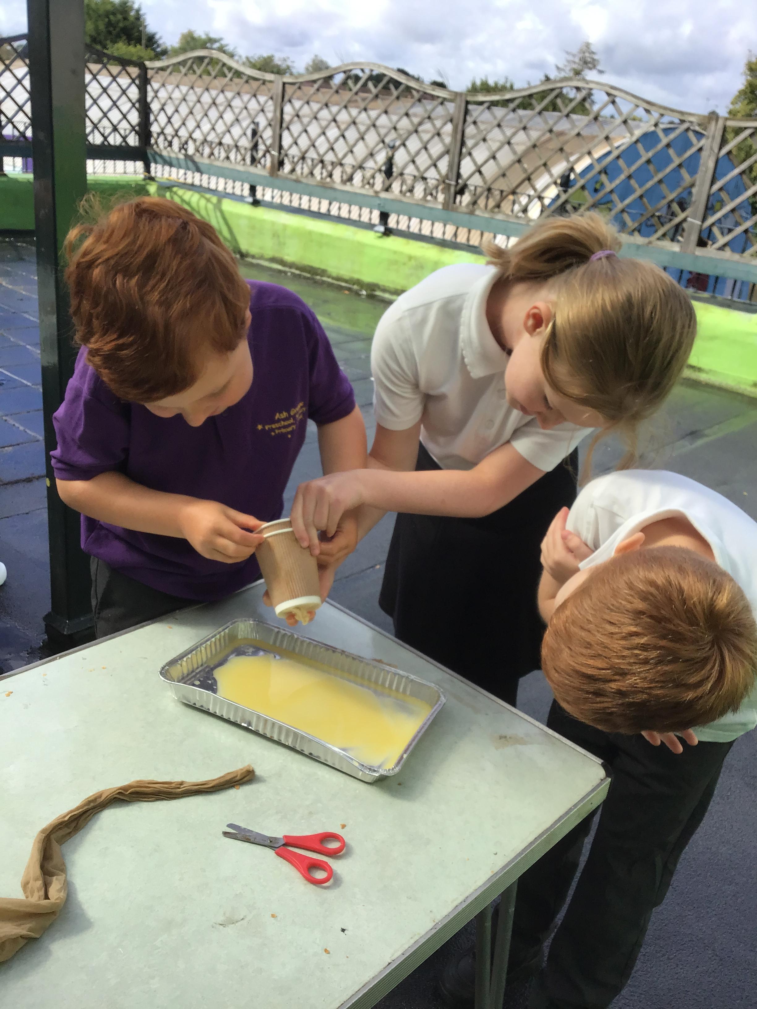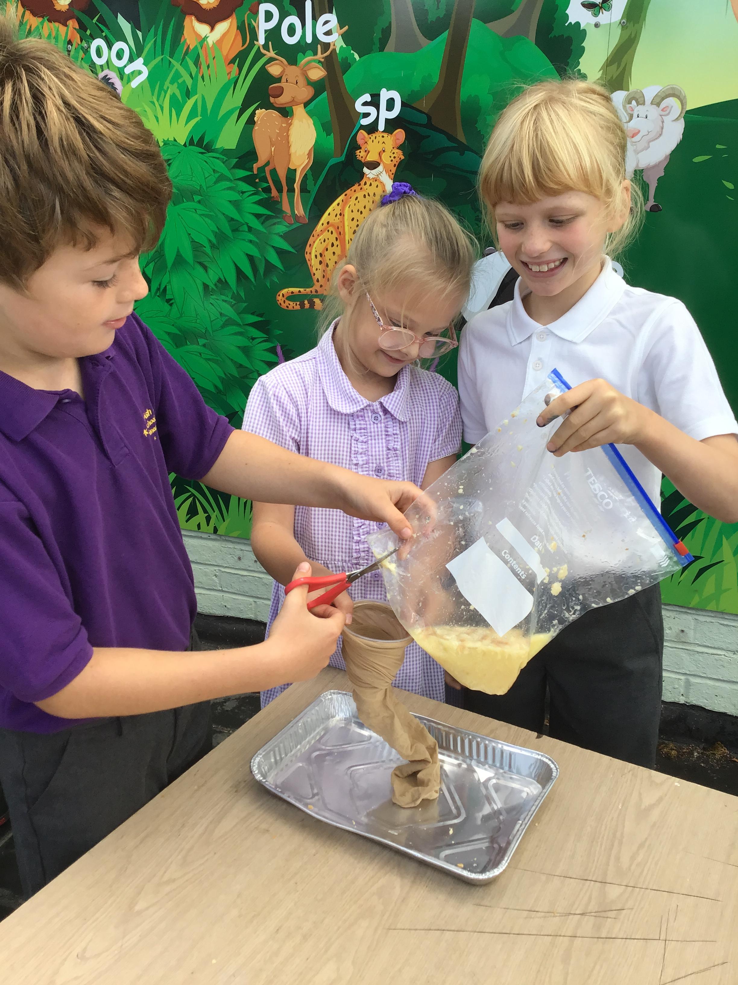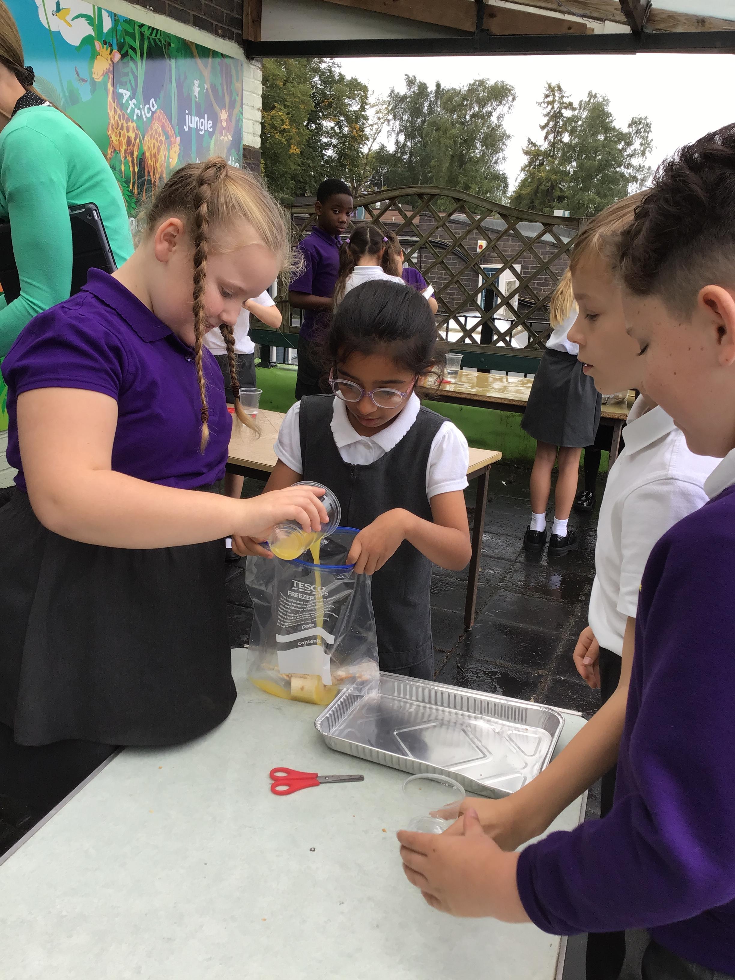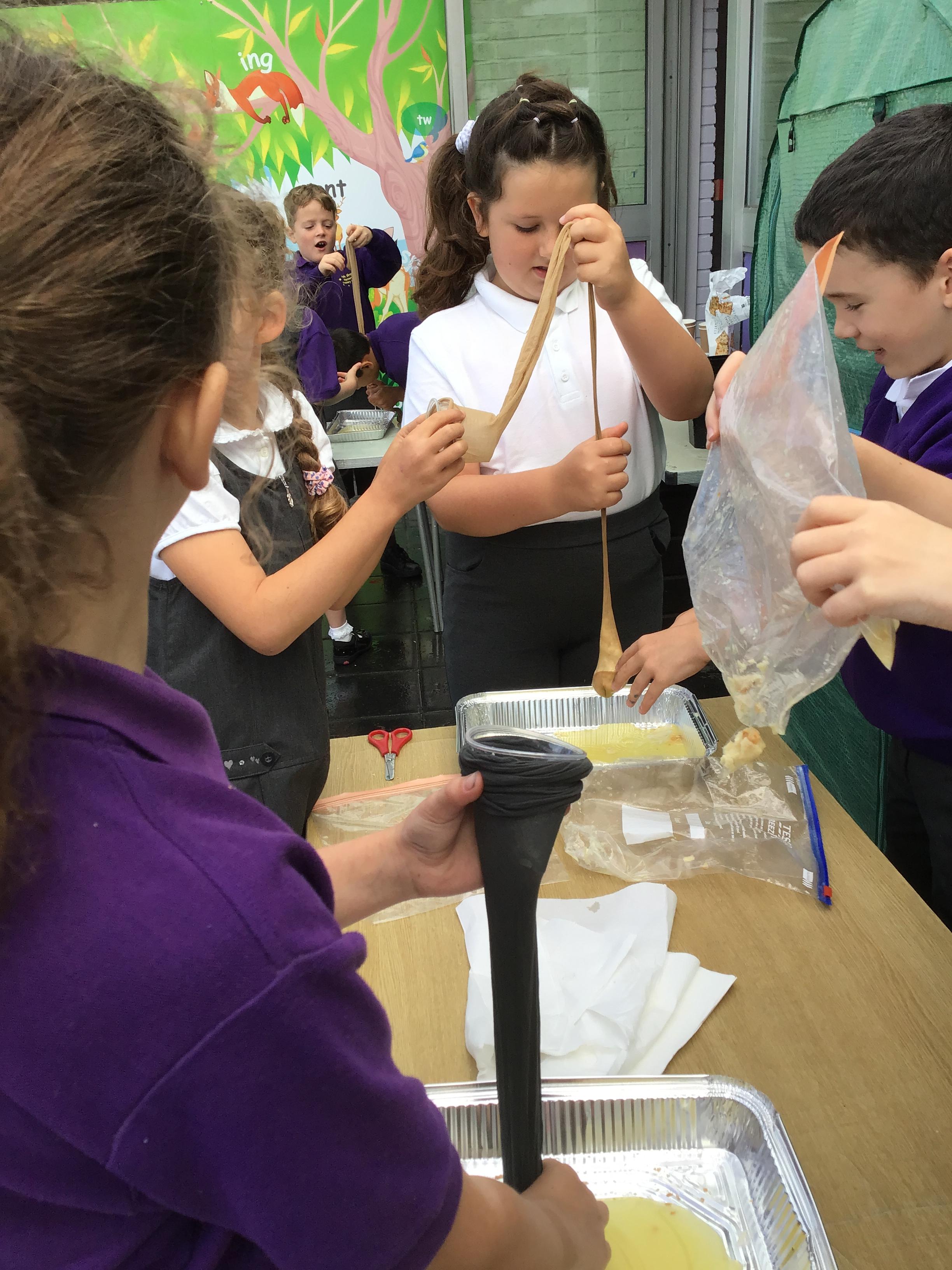 We had a fantastic, if not quite disgusting start to our topic by recreating a model of the digestive system! We use some crackers, banana, orange juice and water to show what happens to our food as it travels to the stomach, before showing how it moves through the small and large intestine, using tights! Eventually, it squeezes out at the other end!!
