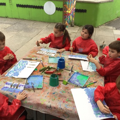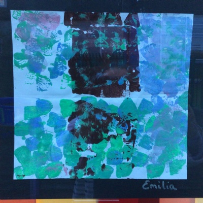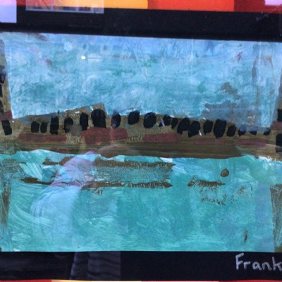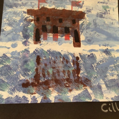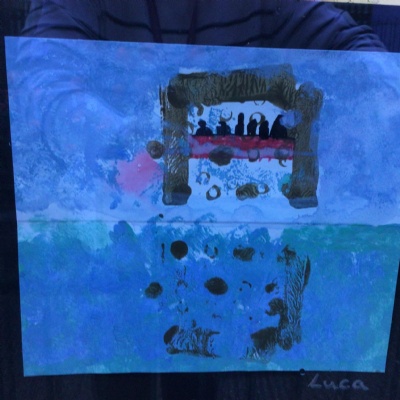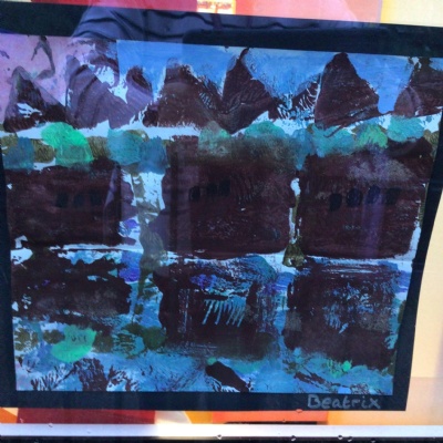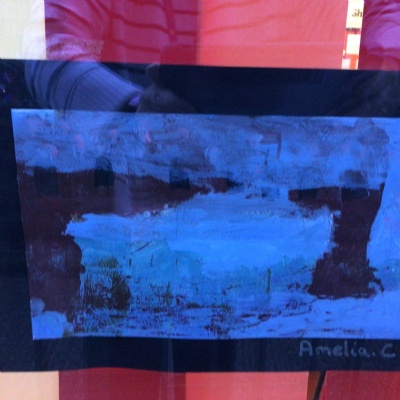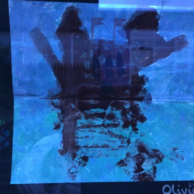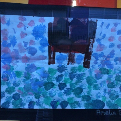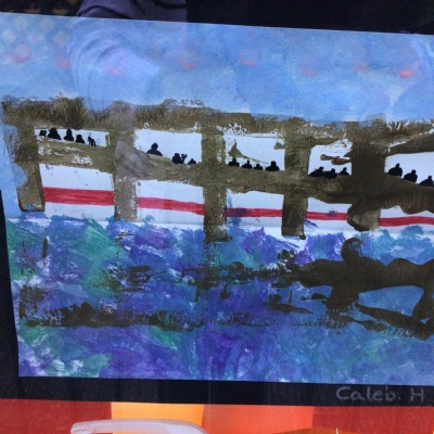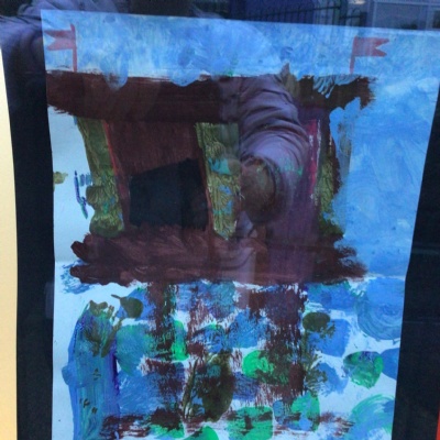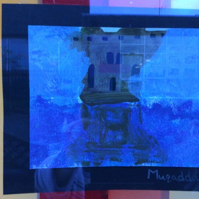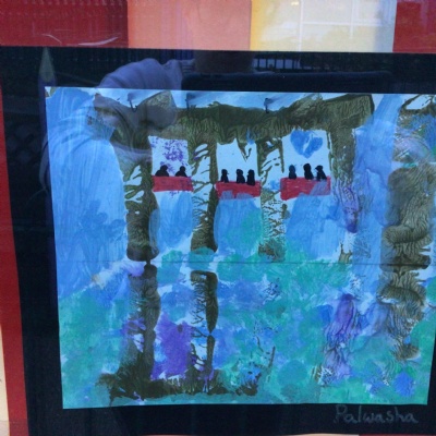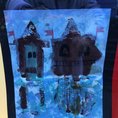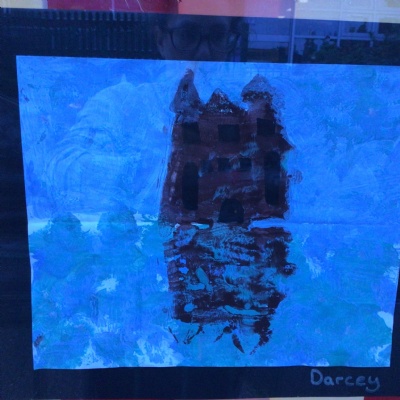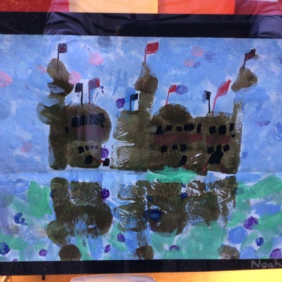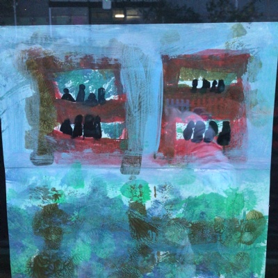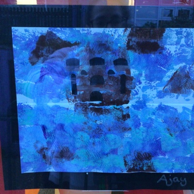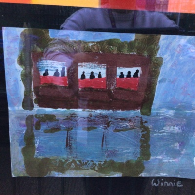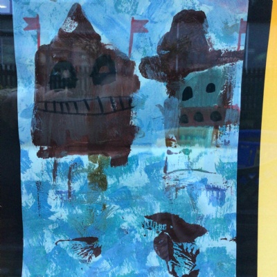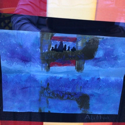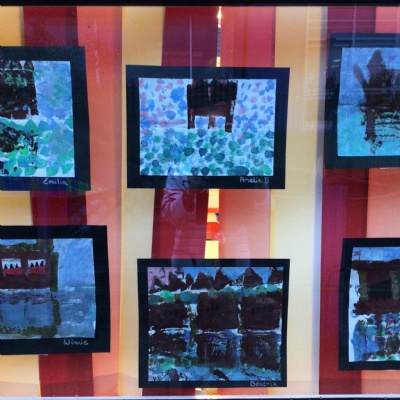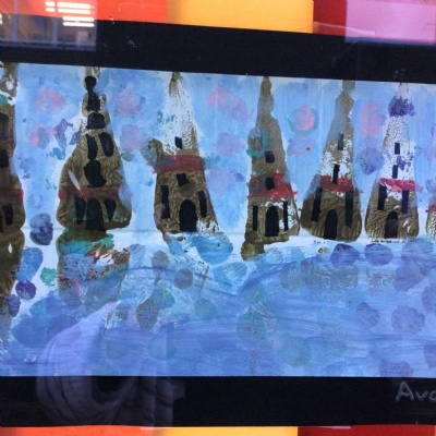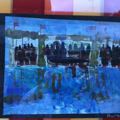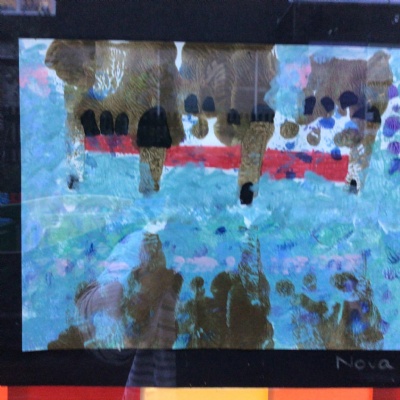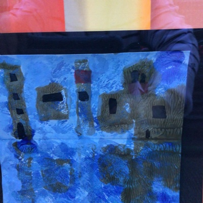 We painted the canal using small brush strokes with different shades of blues, greens and purples. Then we printed the building using wooden blocks.