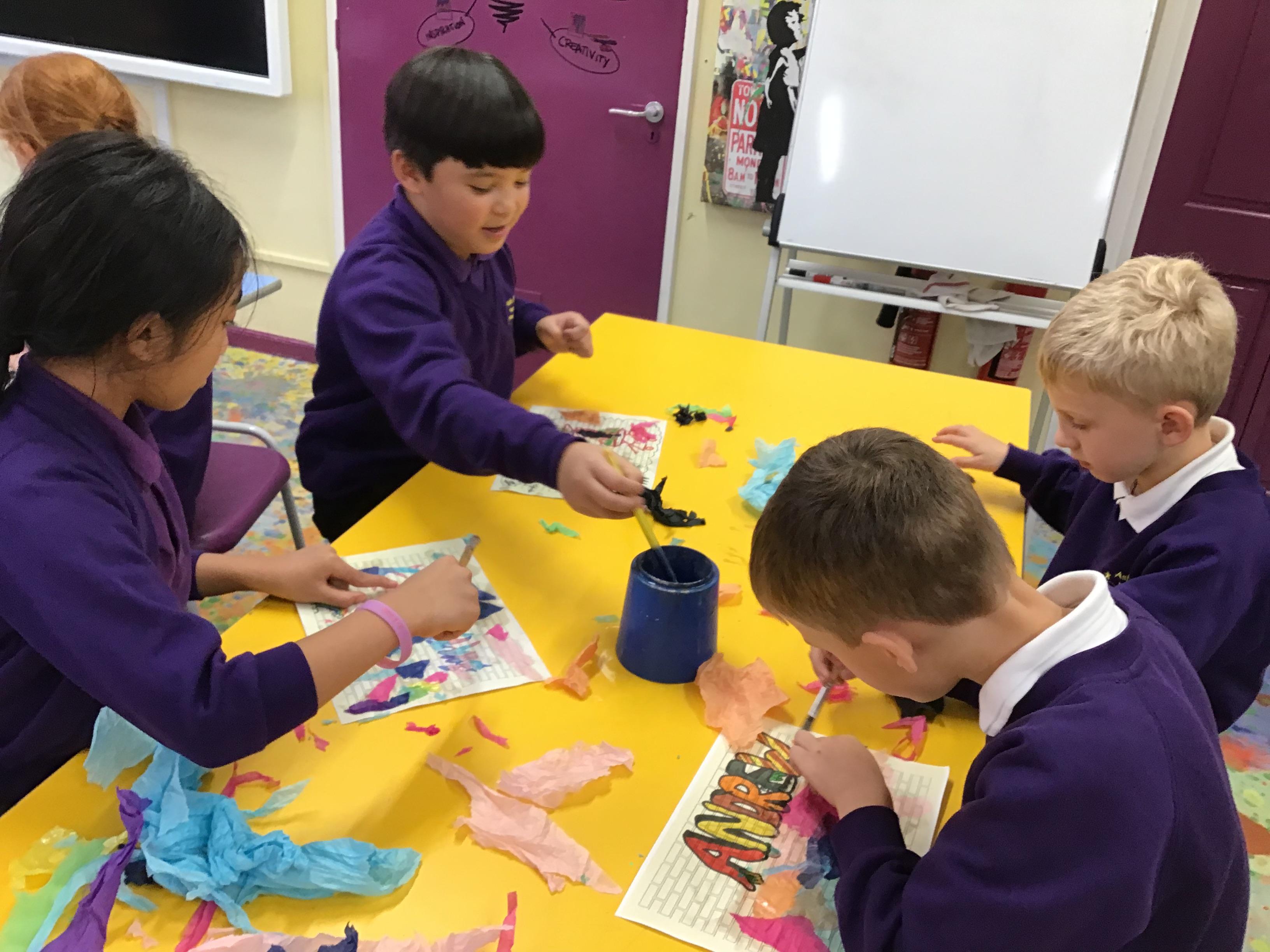 We designed our own name tags using range of fonts and styles, adding a spray paint effect with coloured tissue paper to bring them to life.